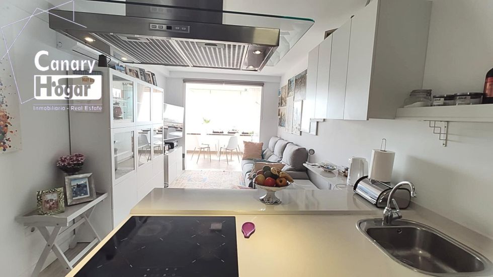 Luxurious and very bright flat in the complex The Sunset in Torviscas Alto with panoramic views to the ocean, mountains, island of La Gomera and swimming pool. The flat consists of an entrance hall, on the right hand side there is a bathroom with shower and window. Passing the hallway is the living room with open plan kitchen and direct access to the covered terrace with panoramic views. On the left side of the corridor there is a bathroom with shower, and two bedrooms, one of which has direct access to the covered terrace. Total area of the flat is 75m2. The flat is completely renovated. There is air conditioning in all rooms. The price also includes a closed garage of 21m2. The complex has lifts, security cameras, very well kept gardens, in the lower part of the complex there are two swimming pools, one of them for children, in the upper part there is a huge heated swimming pool. This flat is perfect for living or for investment.~
