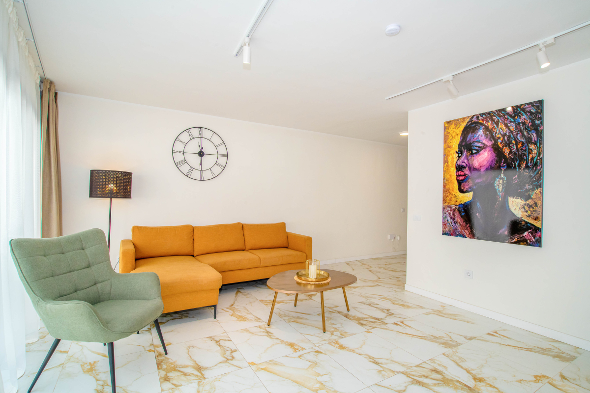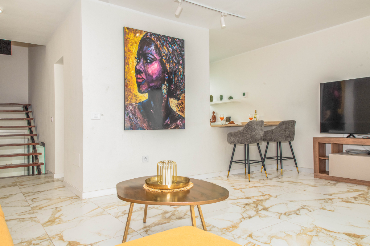 Bright and welcoming space with a cozy seating area, flat-screen TV, and direct access to the terrace overlooking the pool.