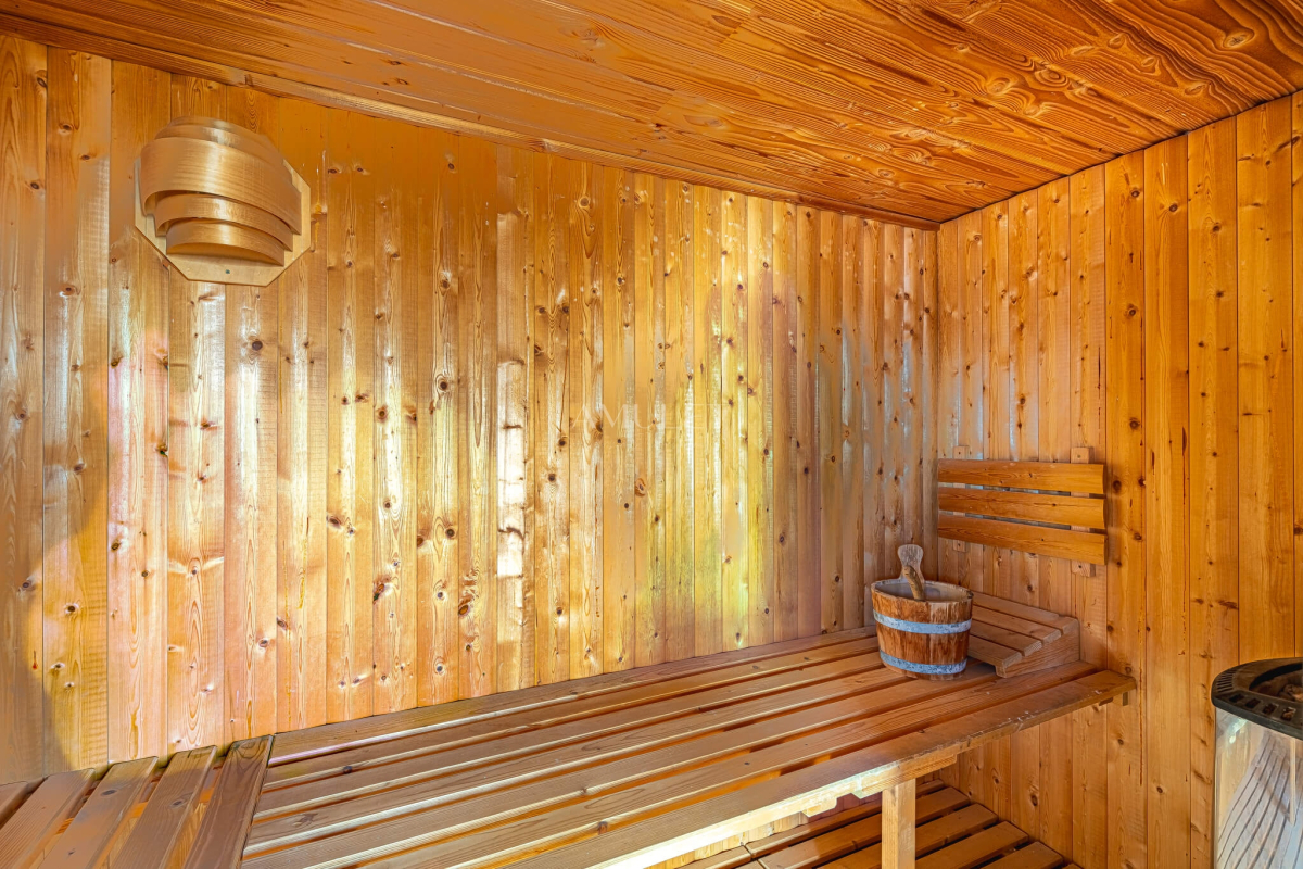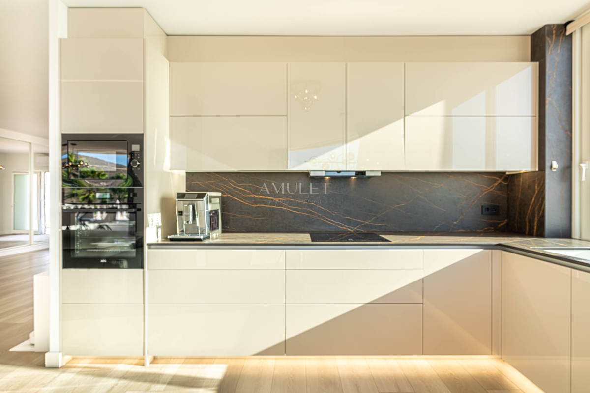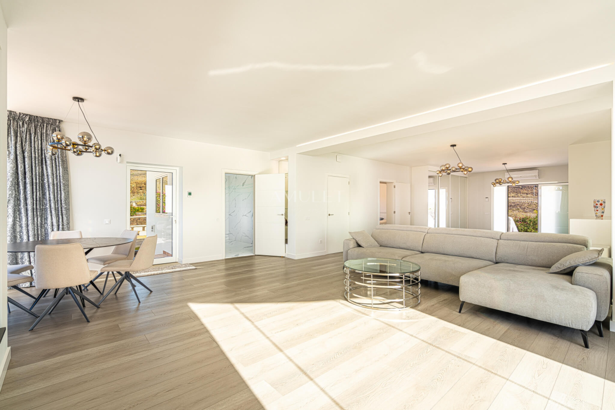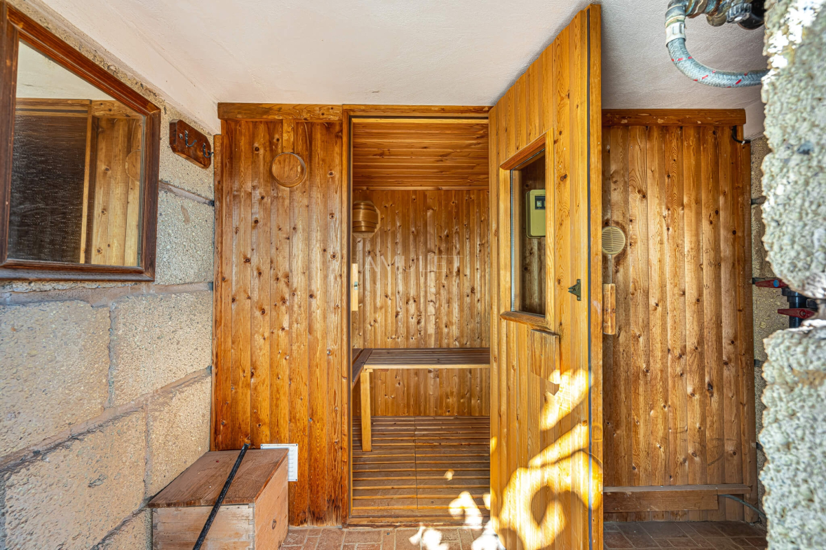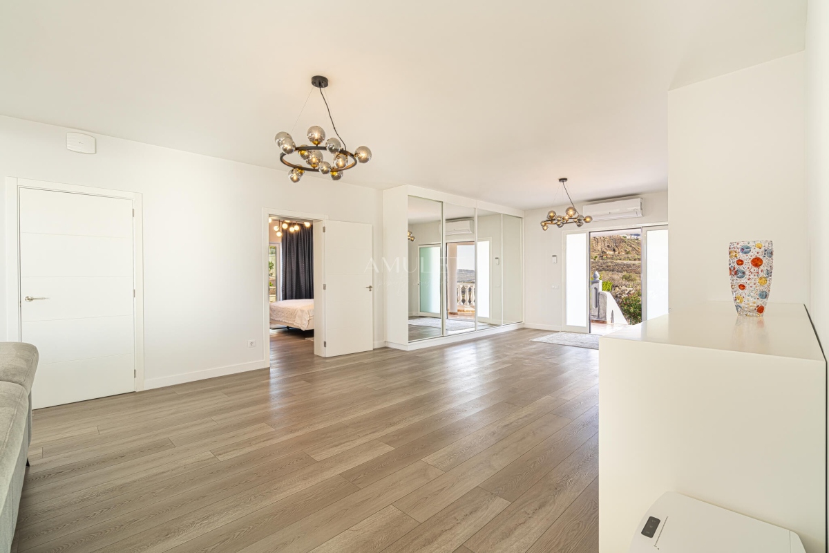 It features two independent levels with private access, two spacious and bright living-dining areas, two modern and functional open-plan kitchens, five bedrooms with en-suite bathrooms and imported wardrobes, as well as climate control in all rooms. Outside, enjoy a private pool next to the BBQ area, a sauna, and a wine cellar for moments of relaxation. The property also includes two garages, a water reservoir, and expansive landscaped areas with space to customize the surroundings.