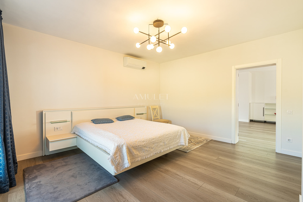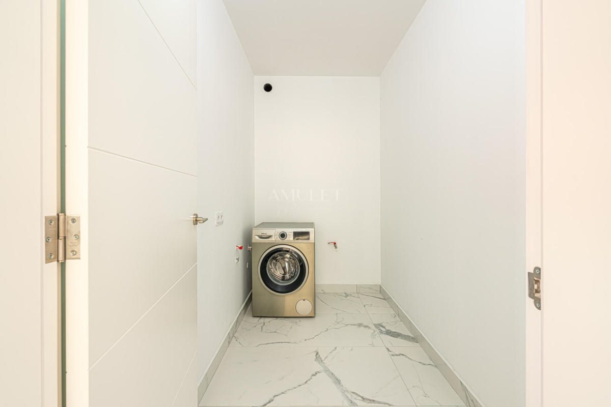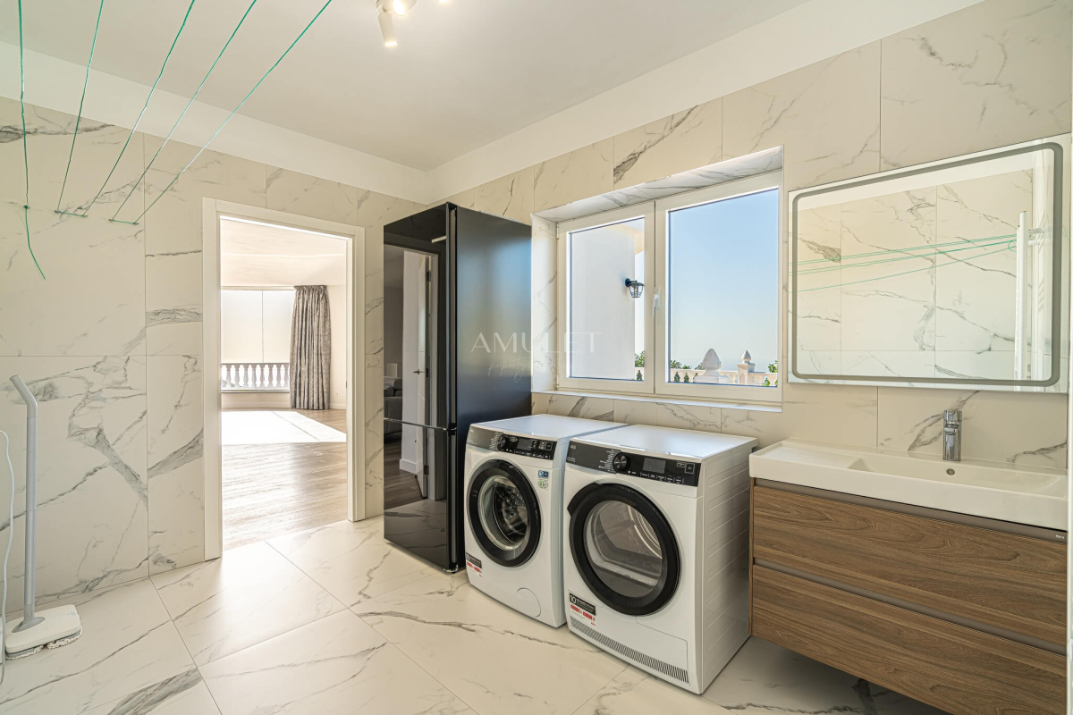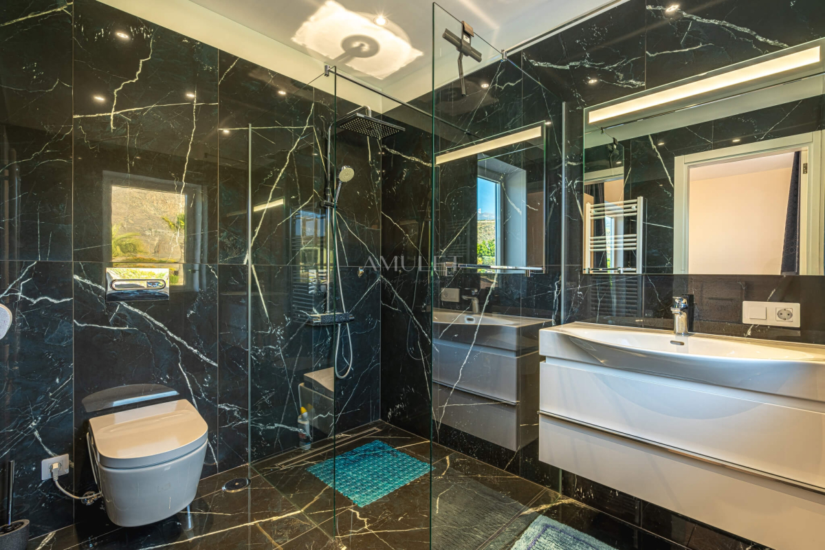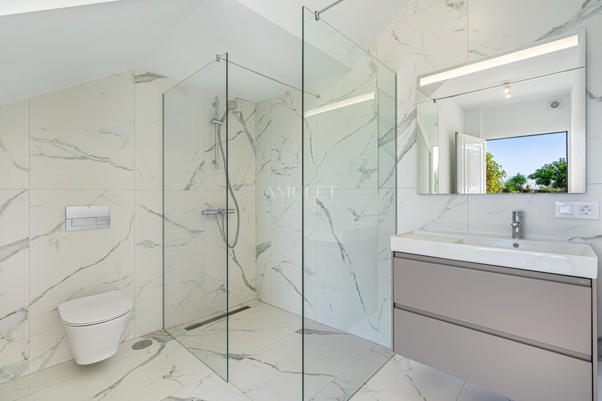 It features two independent levels with private access, two spacious and bright living-dining areas, two modern and functional open-plan kitchens, five bedrooms with en-suite bathrooms and imported wardrobes, as well as climate control in all rooms. Outside, enjoy a private pool next to the BBQ area, a sauna, and a wine cellar for moments of relaxation. The property also includes two garages, a water reservoir, and expansive landscaped areas with space to customize the surroundings.