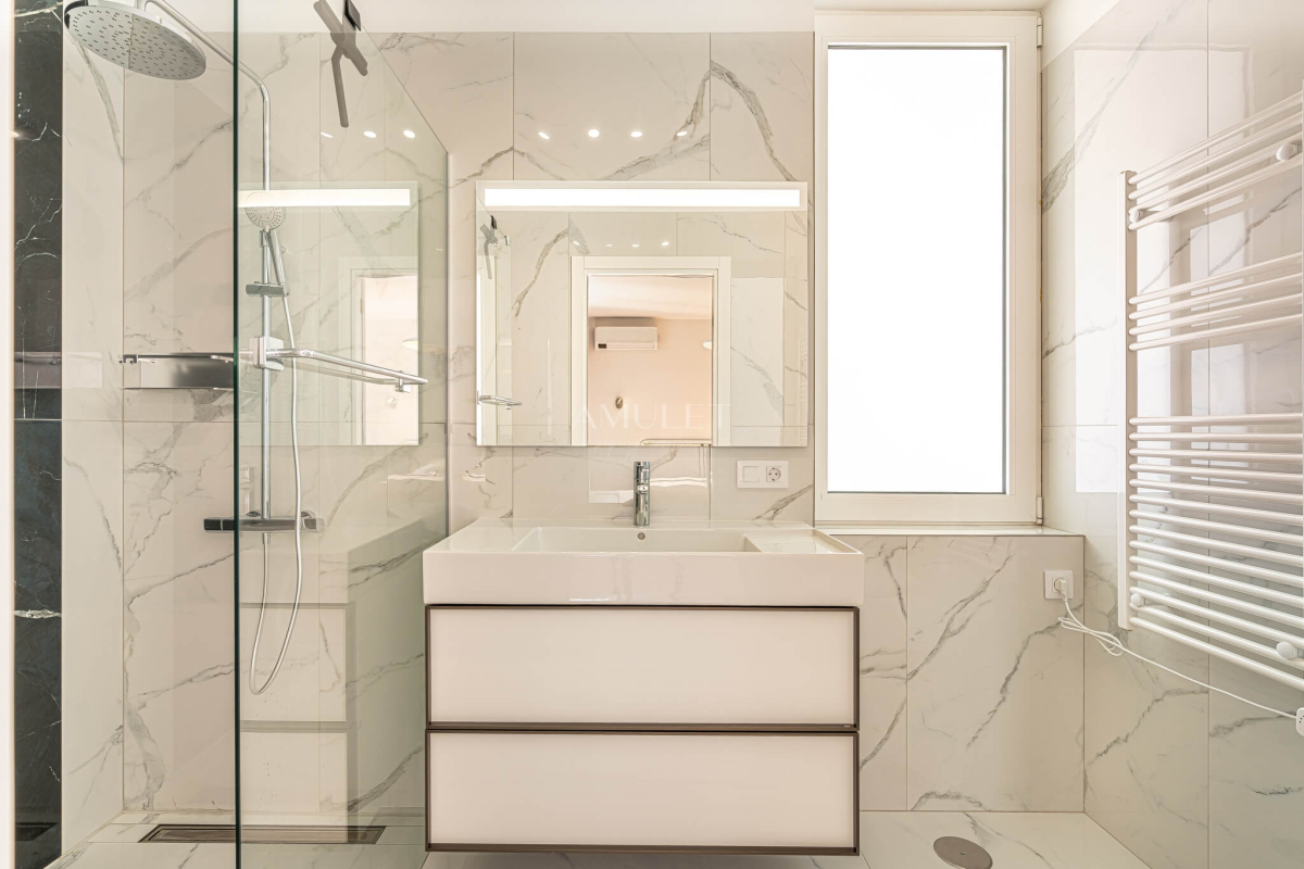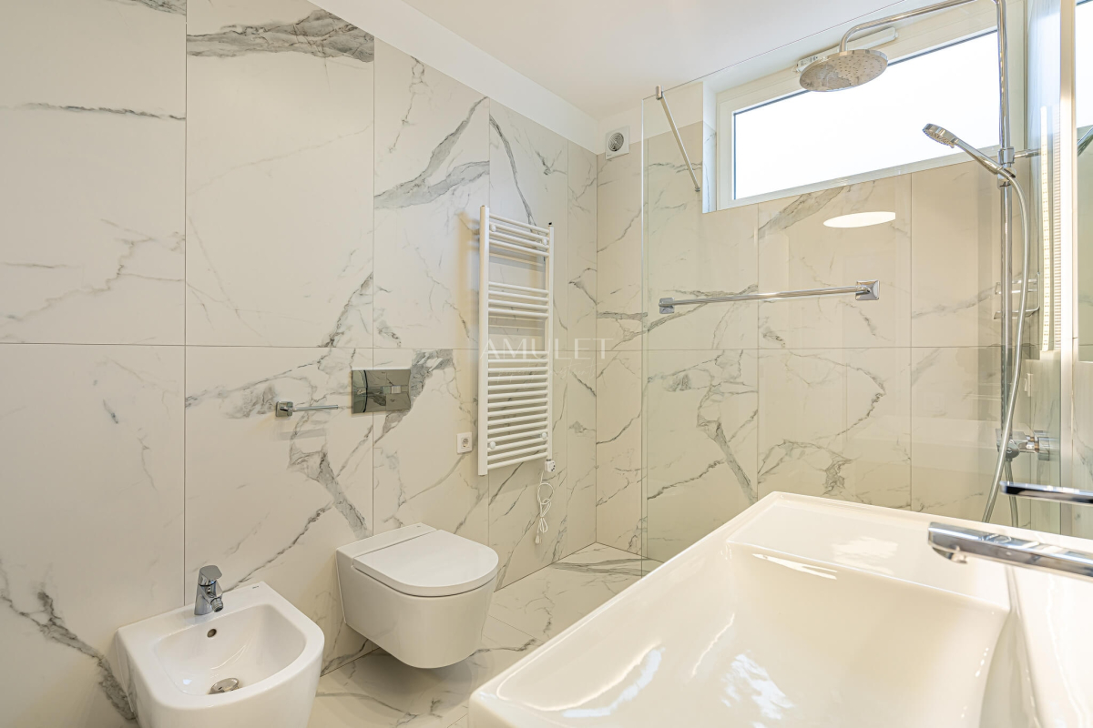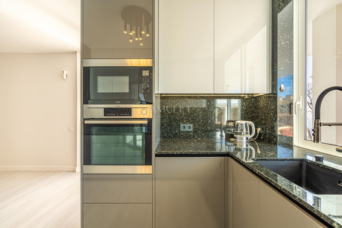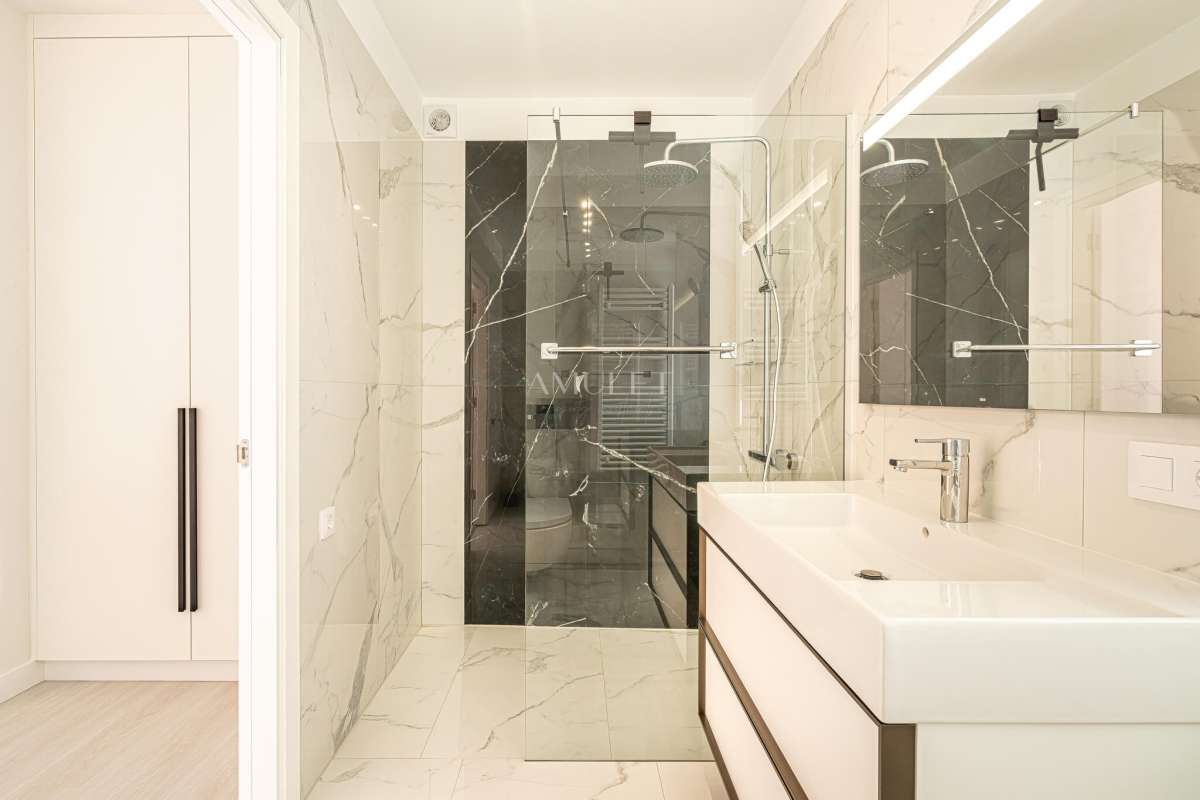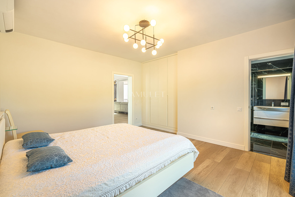 It features two independent levels with private access, two spacious and bright living-dining areas, two modern and functional open-plan kitchens, five bedrooms with en-suite bathrooms and imported wardrobes, as well as climate control in all rooms. Outside, enjoy a private pool next to the BBQ area, a sauna, and a wine cellar for moments of relaxation. The property also includes two garages, a water reservoir, and expansive landscaped areas with space to customize the surroundings.