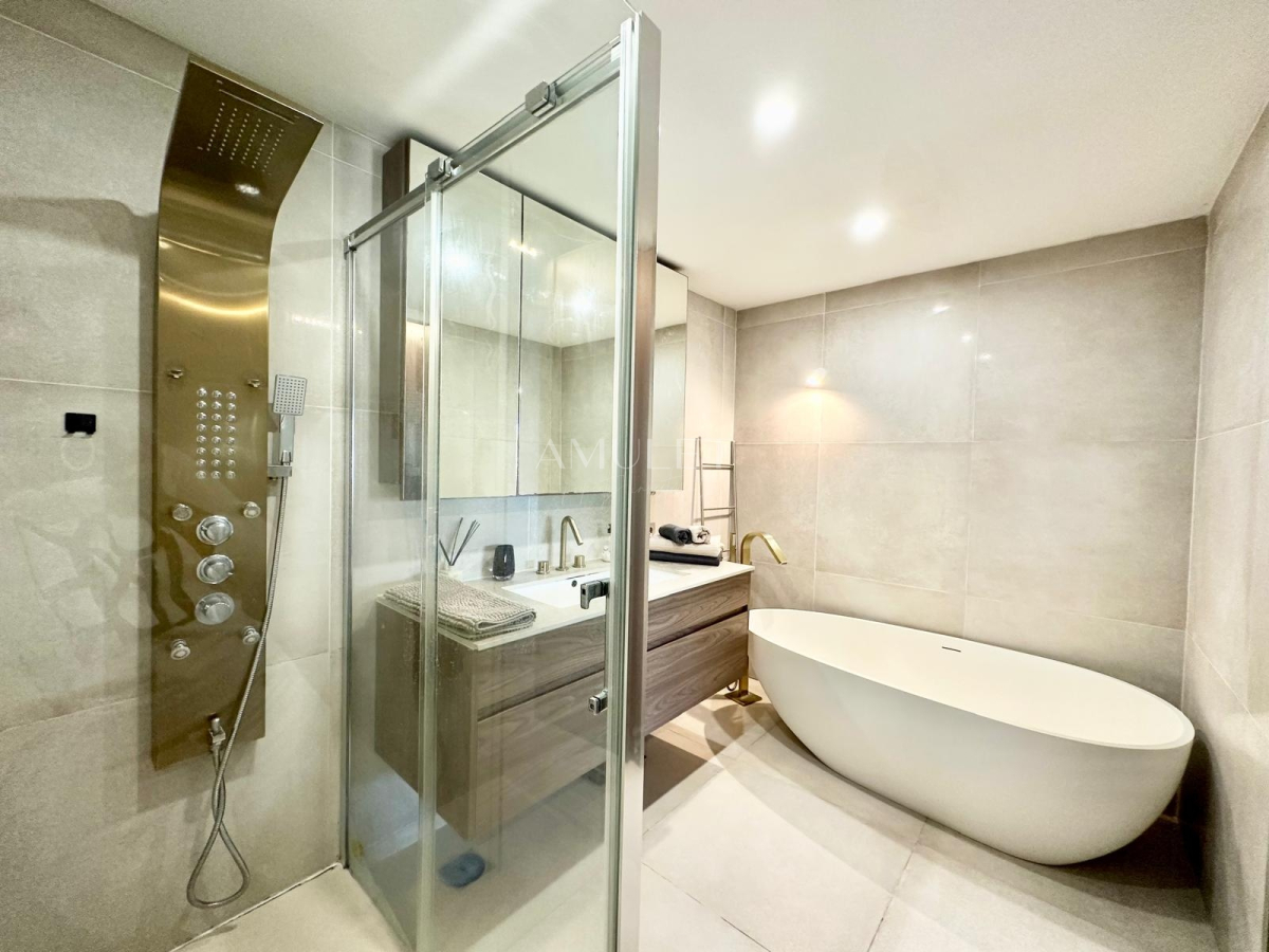 With a total area of 222 m², the property features three bedrooms, including a master suite with an en-suite bathroom cleverly integrated into the built-in wardrobe. There are two full bathrooms, one of them en-suite—both with showers, and the main one also with a bathtub.