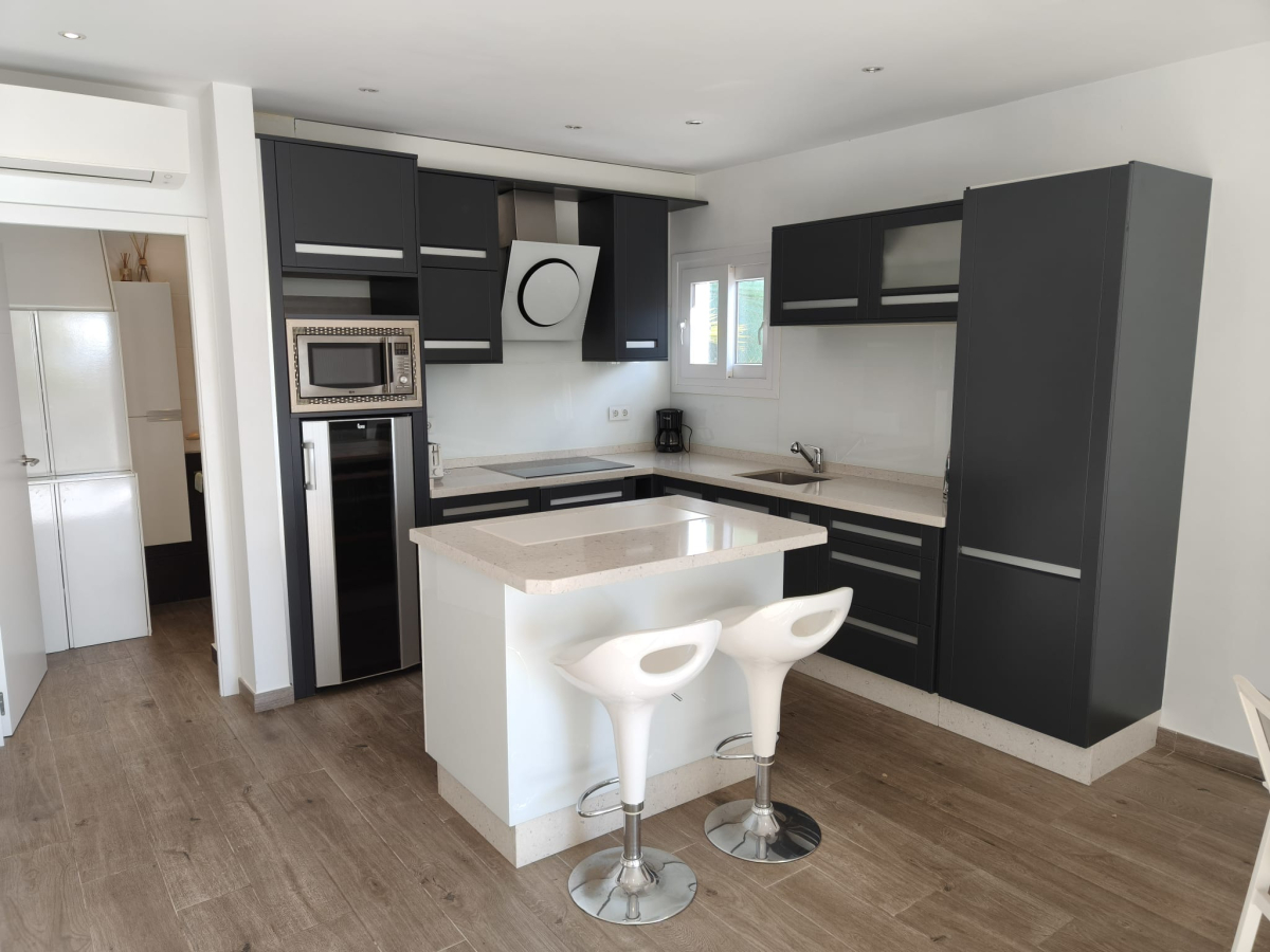The property features a new American-style kitchen equipped with the latest appliances, seamlessly connected to a modern living area with direct access to a spacious terrace, ideal for relaxation and outdoor living. There is also a new bathroom with LED ambient lighting, adding a contemporary and elegant touch.