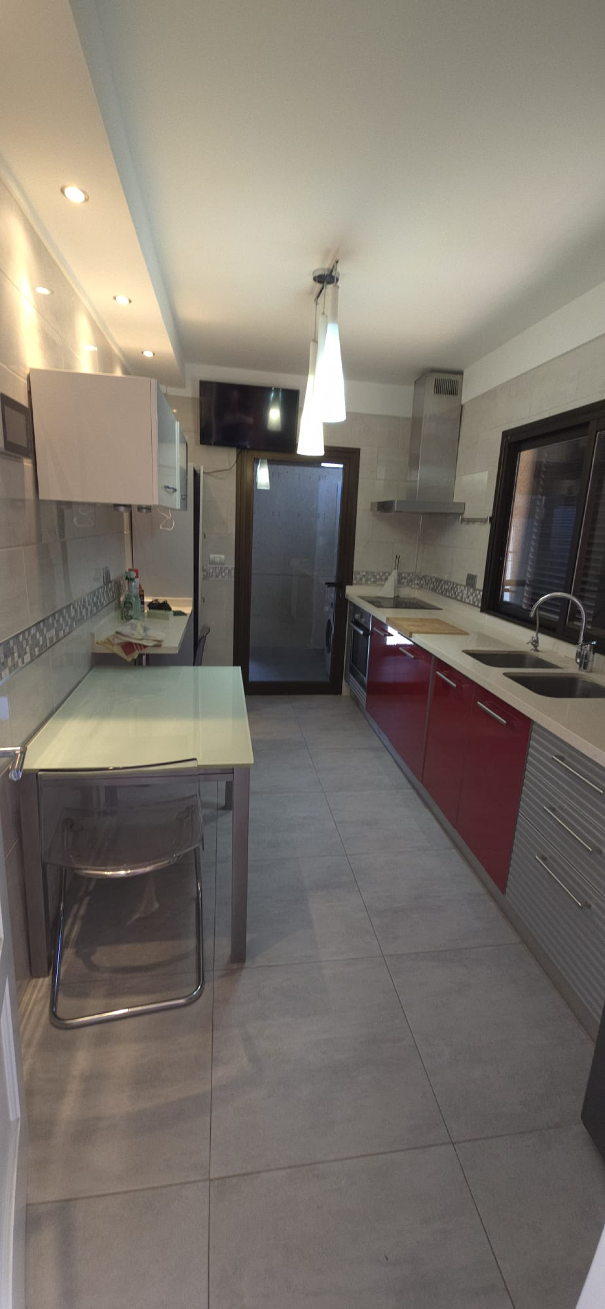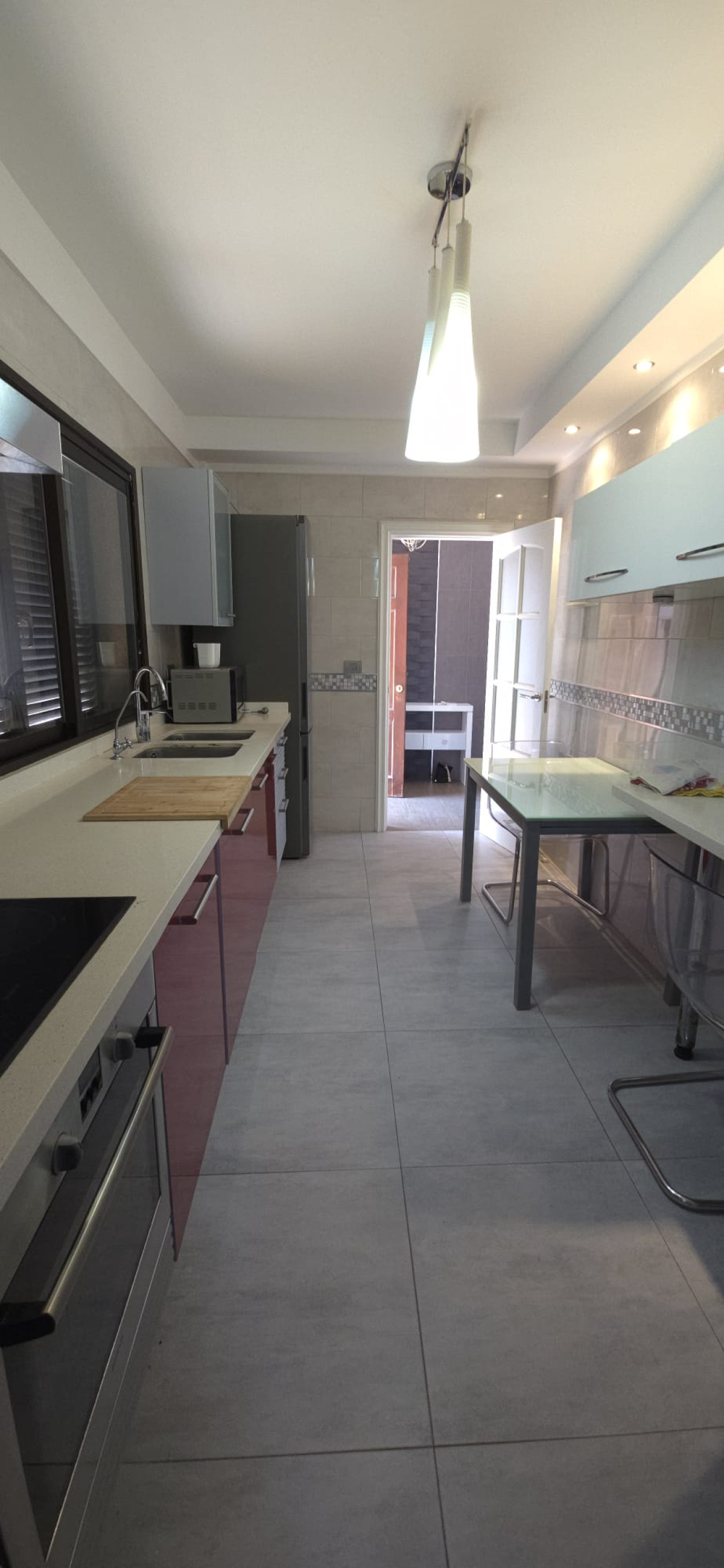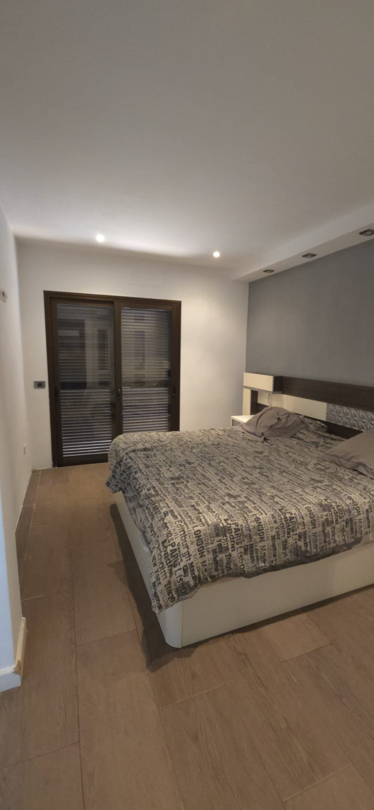The independent kitchen comes fully furnished and equipped, featuring a convenient utility room. The spacious living-dining area, with a 4-meter-high ceiling and large front windows, fills the home with natural light and opens directly to the front garden, creating a bright and airy atmosphere.